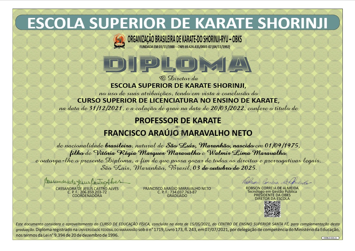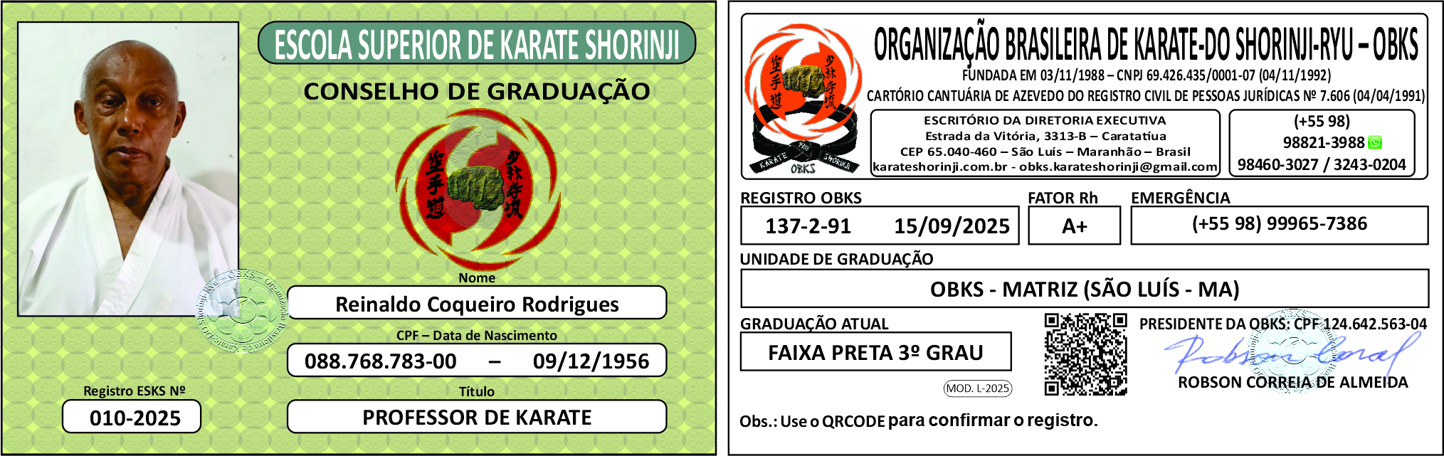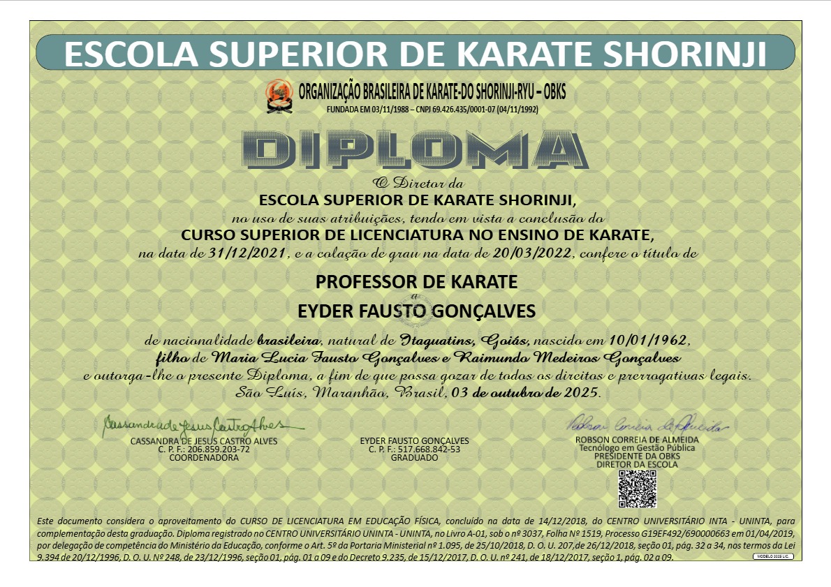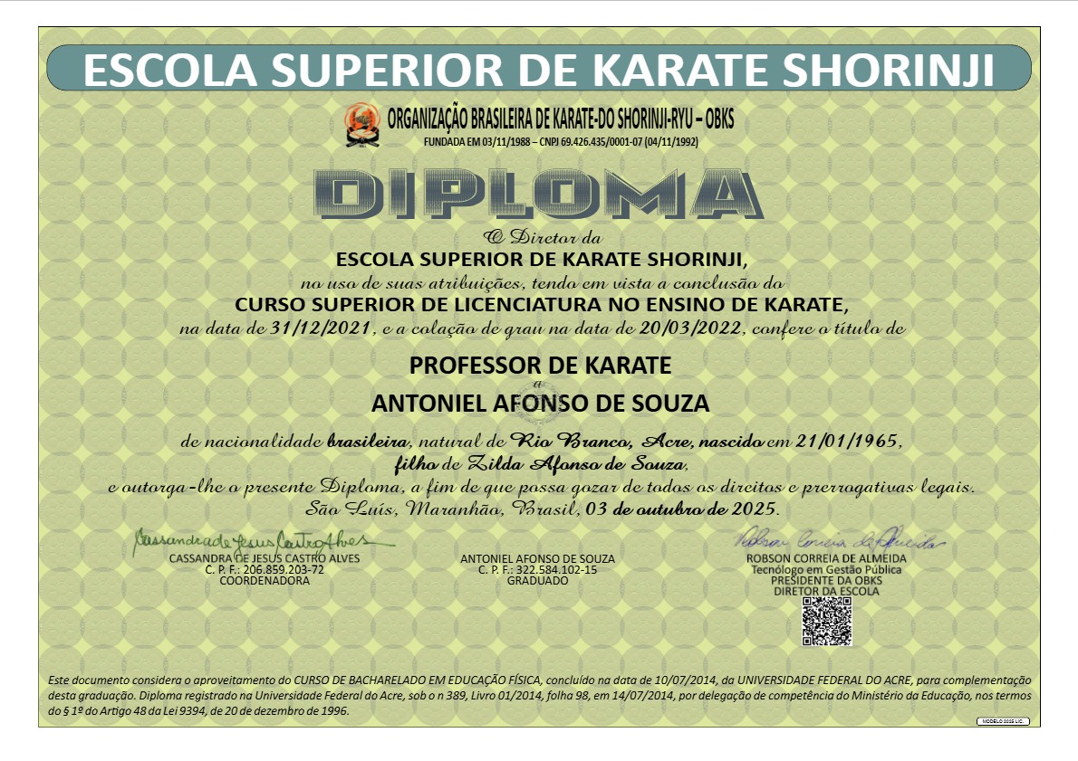 3º DAN (03/10/2025); 2º DAN (04/11/2021); 1º DAN (2017). Coordenador de Eventos para o Estado de Rondônia. |